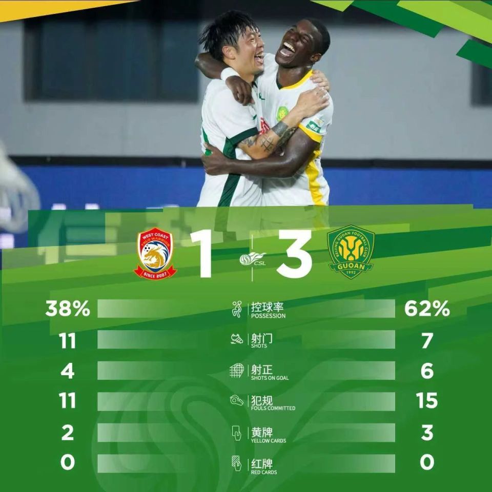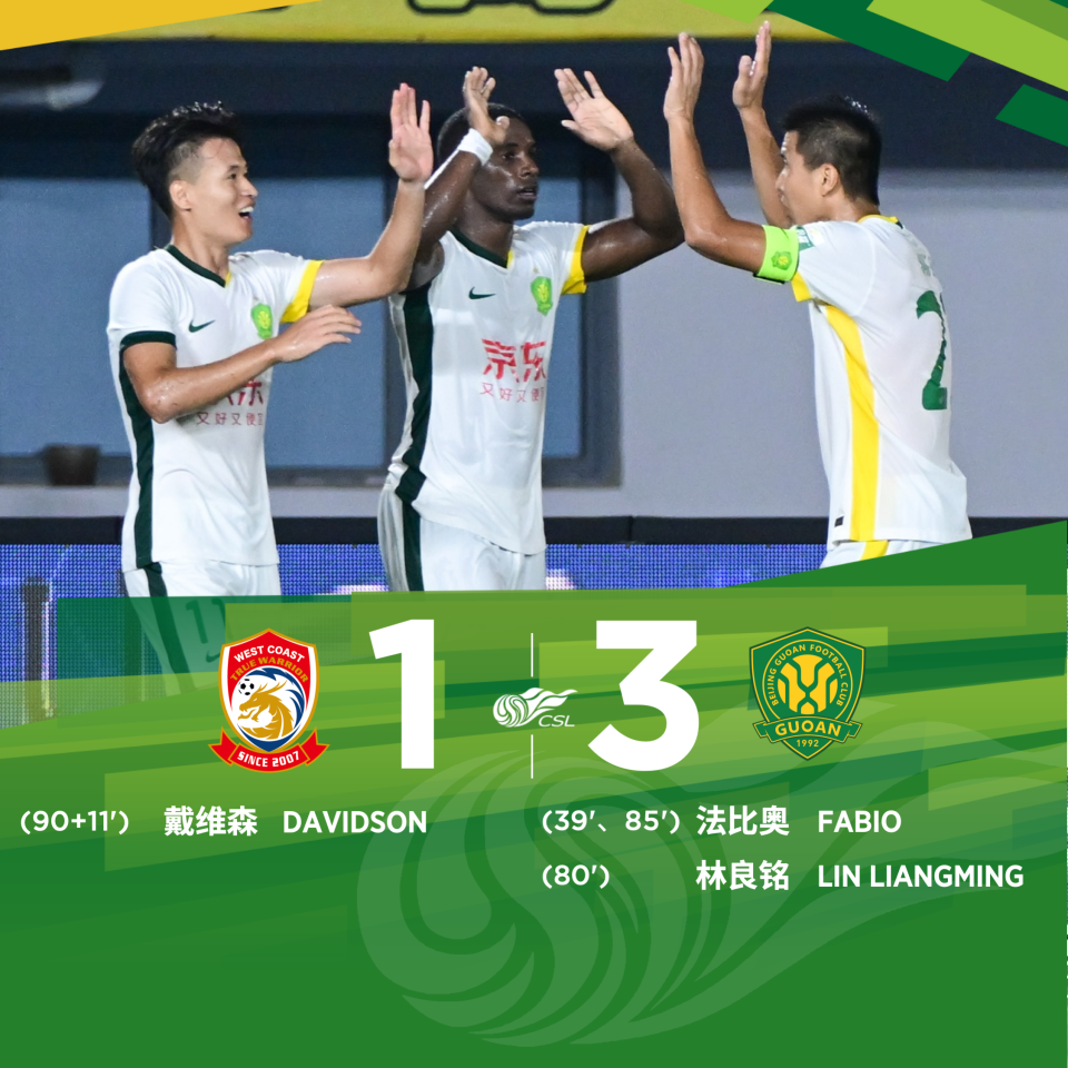 战报 - 法比奥梅开二度 林良铭破门 北京国安 3-1 青岛西海岸
